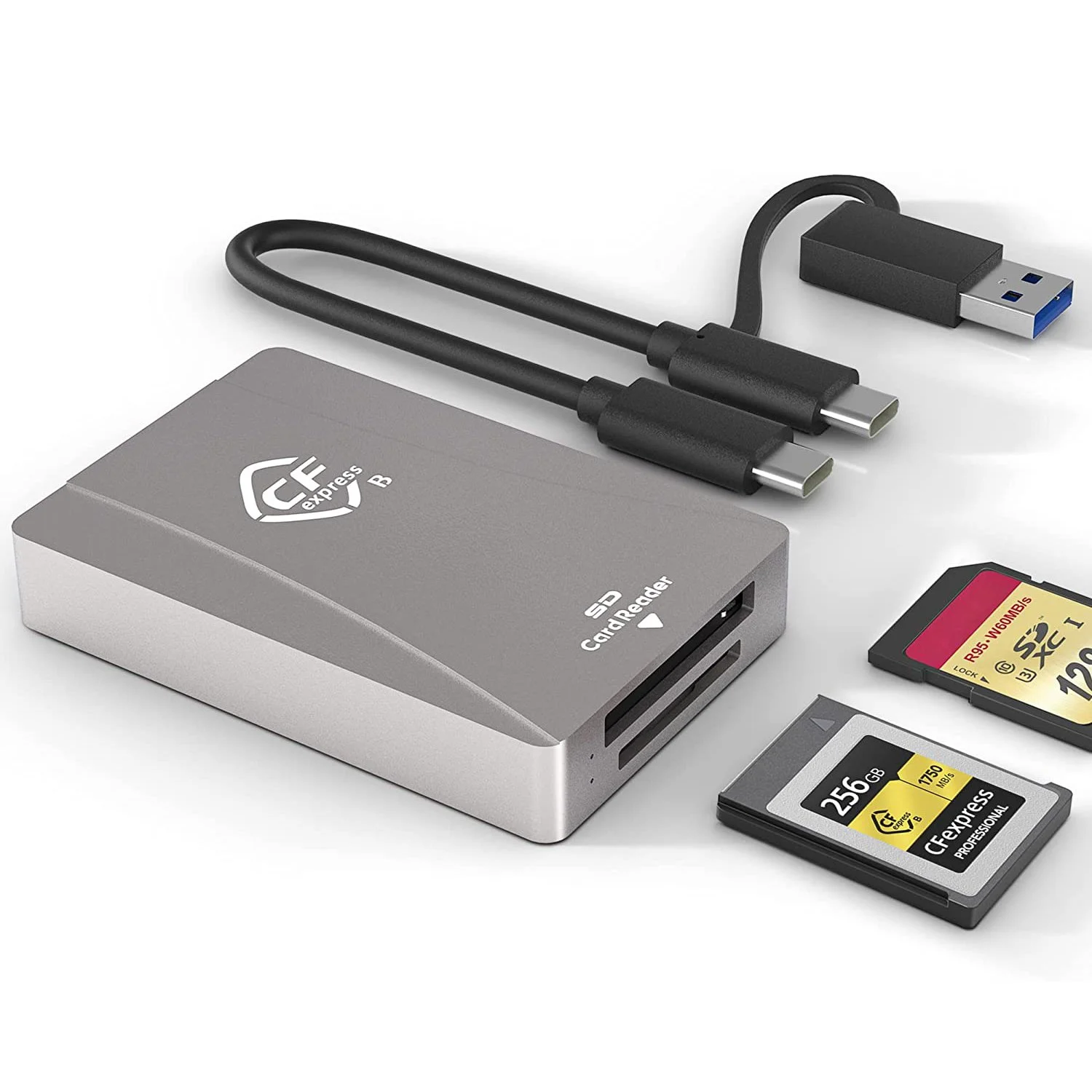 Read both SD and CFexpress cards with this one tool. It has a USB and USB-C cable.